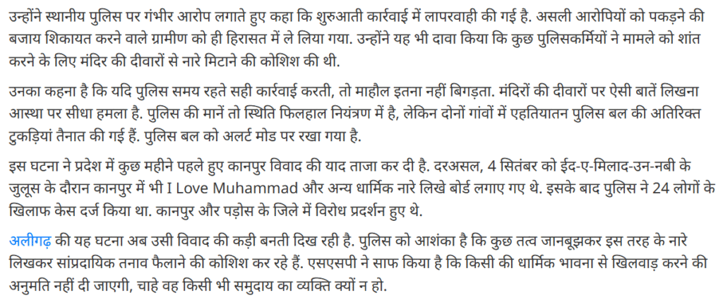 अलीगढ़ के दो गांवों में मंदिर की दीवारों पर ‘I Love Muhammad’ लिखे जाने के बाद माहौल गर्म हो गया. आस्था और आरोपों के बीच पुलिस ने 8 लोगों पर केस दर्ज..फोरेंसिक टीम जांच में जुटी है, जबकि करणी सेना ने पुलिस पर पक्षपात का आरोप लगाया.
