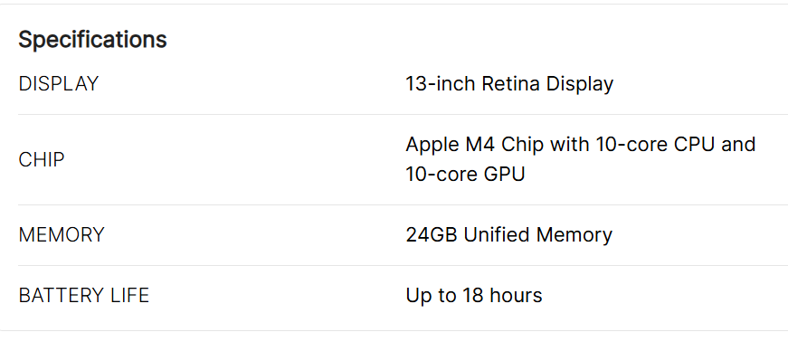 Apple MacBook Air laptops have always stood out for their great features. This MacBook laptop comes with the advanced M4 chip, delivering faster processing power, a 10 core CPU, and GPU, best for doing multiple tasks at once without issues. Boasting 16GB memory and 256GB of SSD storage, it’s a top choice for those wanting quick performance in a portable package.
